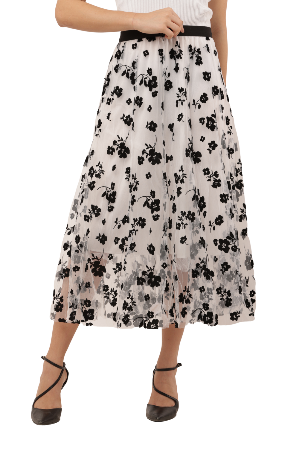 Elevate your style with our Black Mesh Floral Embroidered Korean Long Skirt. Designed with a flattering high waist and a flowy A-line silhouette, this pleated midi skirt is a perfect blend of elegance and Korean fashion. The sheer mesh overlay is delicately embroidered with bold black florals, creating a striking contrast against the white lining. The elastic waistband ensures comfort while maintaining a chic, structured fit. Whether you're dressing up for a brunch or styling it casually, this skirt is a versatile statement piece in any wardrobe.