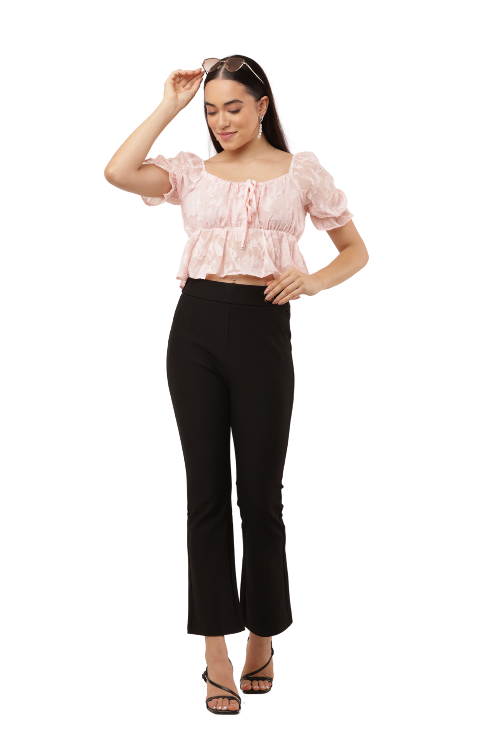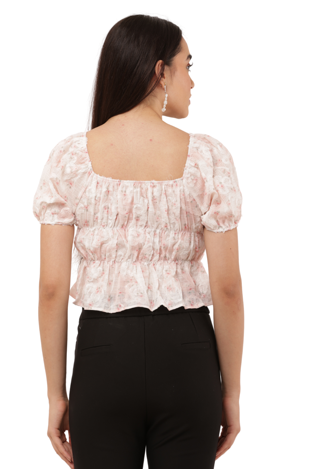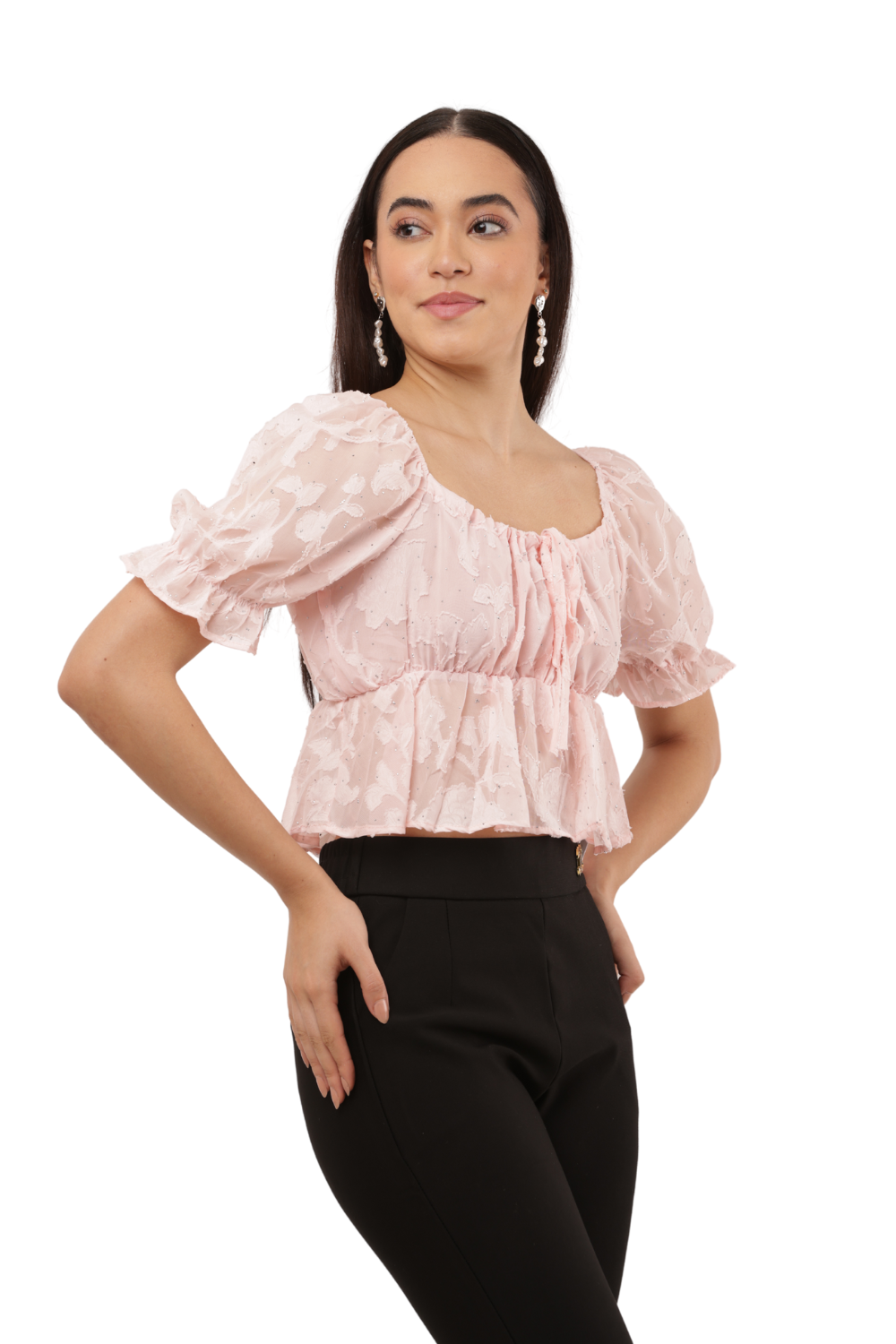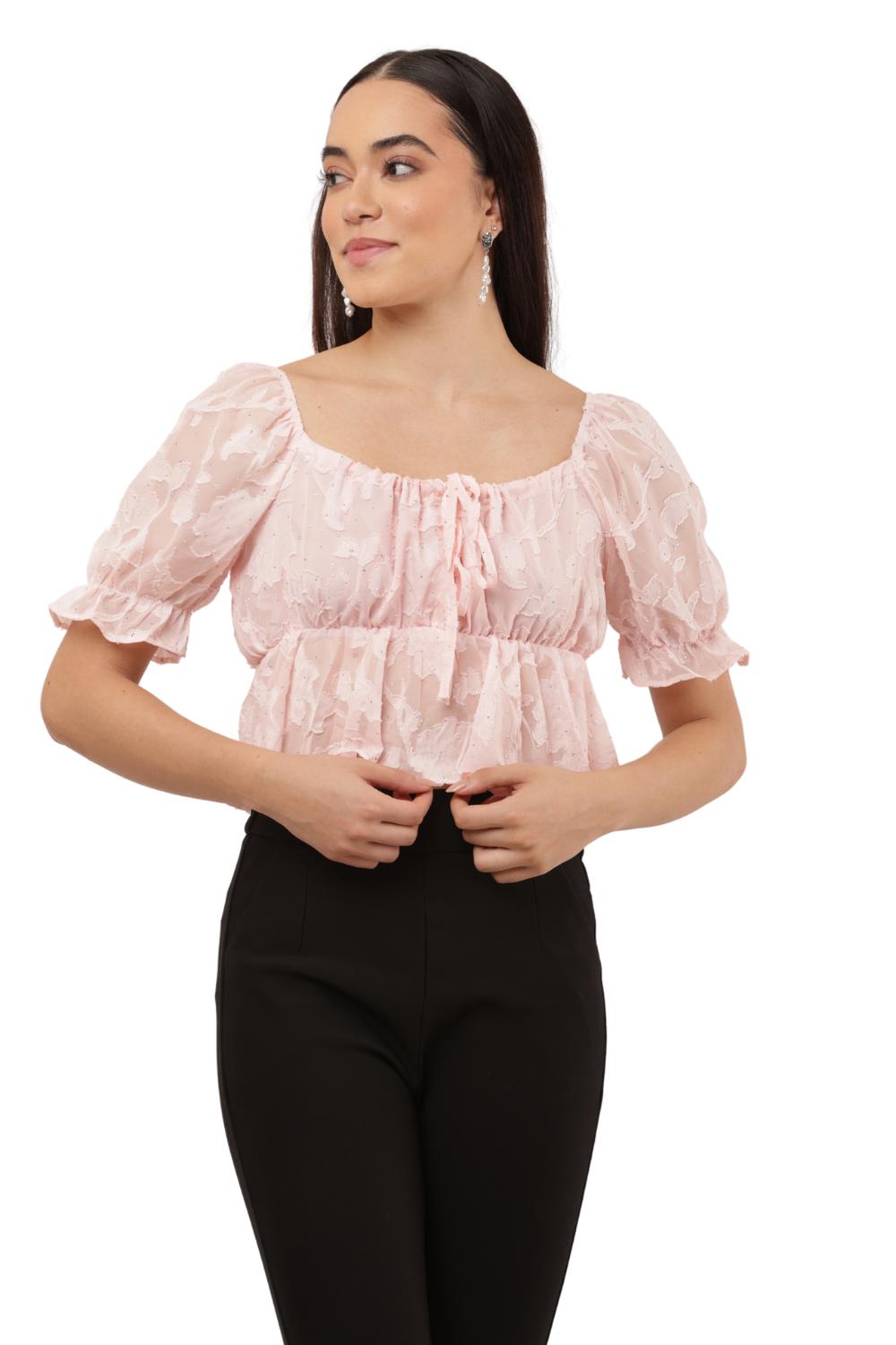 Add a dreamy charm to your wardrobe with this Blush Pink Floral Sheer Puff Sleeve Peplum Top. Featuring a delicate floral textured design and soft gathers, this Korean-inspired top is made from a lightweight, semi-sheer fabric that feels as romantic as it looks. The elasticated neckline and sleeves, combined with a soft peplum waist, create a flattering, feminine silhouette perfect for brunches, dates, or casual outings.