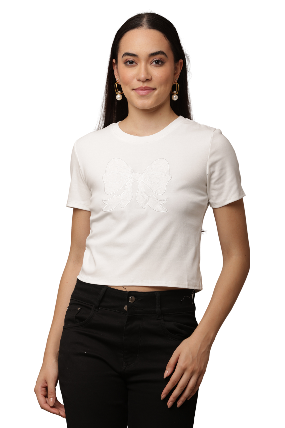 Bow Embroidered Crop Top Free Size – Korean T-Shirts for Women | Korean Fashion Tee