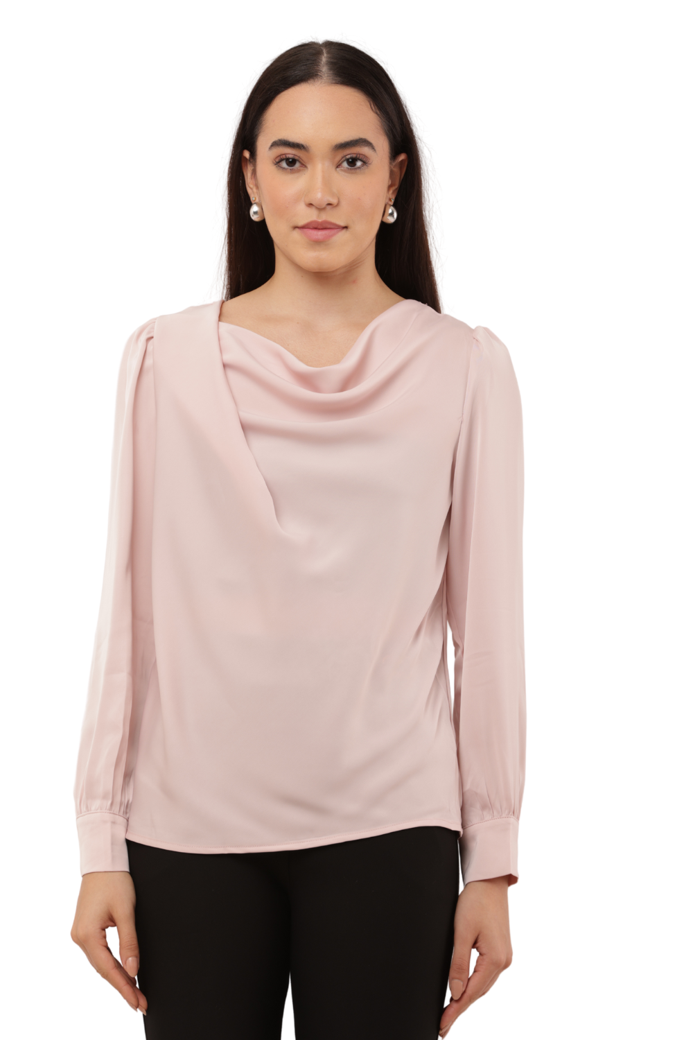 Elevate your wardrobe with this elegant draped neck blouse, inspired by the timeless sophistication of Korean fashion. The flowy silhouette features a graceful cowl neckline, subtle puffed shoulders, and long sleeves with refined button cuffs. This versatile piece blends simplicity with feminine detail, making it perfect for both office settings and polished casual looks. Pair it effortlessly with trousers or a skirt for a chic, put-together outfit.
