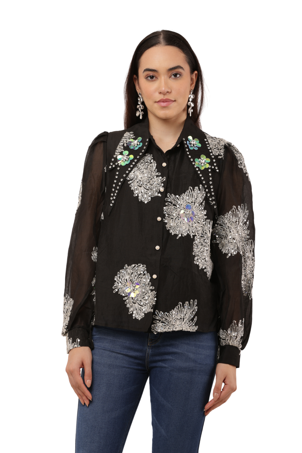 Turn heads with this elegant black sheer shirt, featuring intricate floral sequin embroidery and statement crystal detailing. Designed in a loose, boxy silhouette, this top blends the charm of Korean fashion with contemporary styling. The light, airy fabric gives a soft and graceful fall, making it perfect for semi-formal gatherings or festive events.