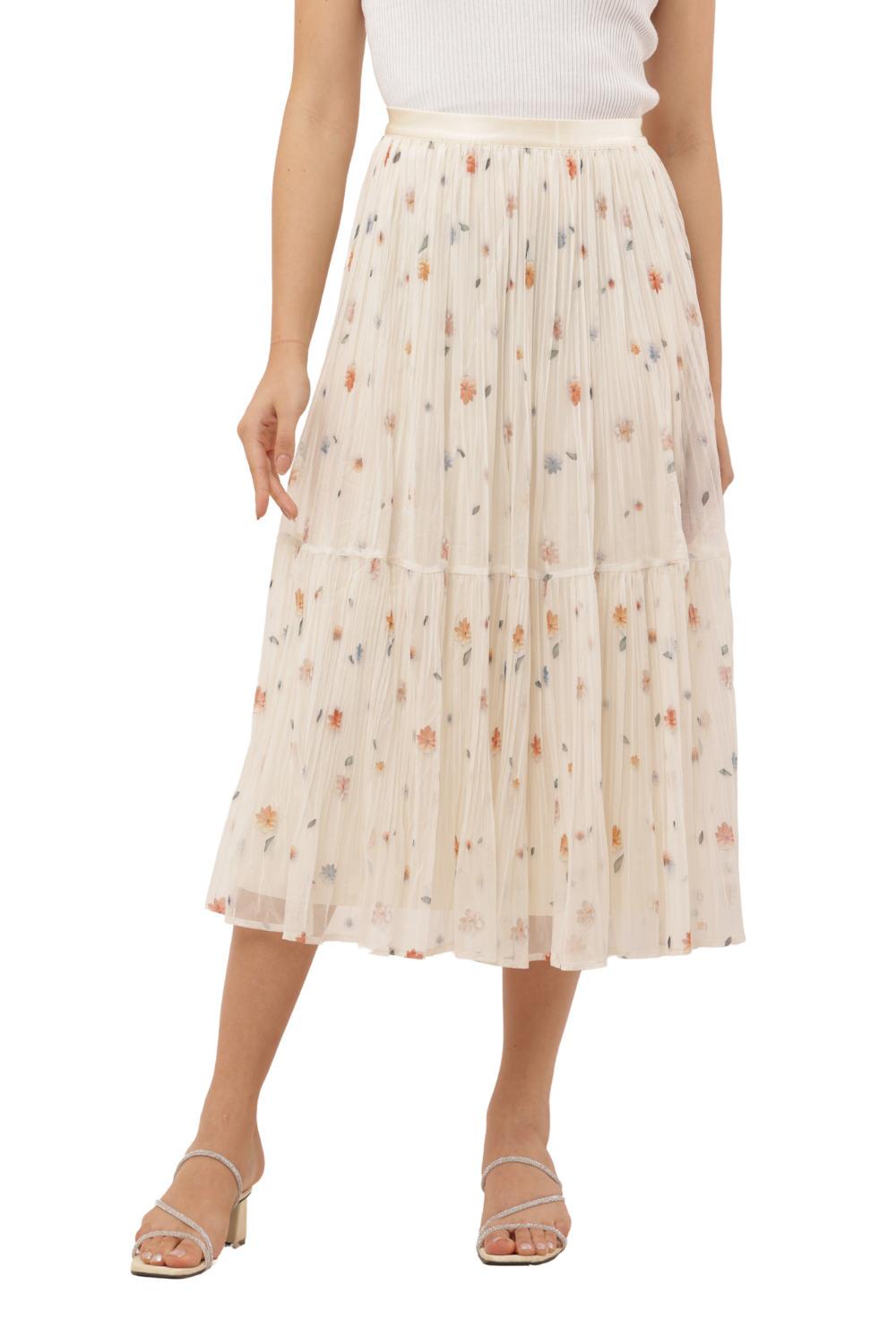 Floral Pleated Mesh Midi Skirt – High Waist, Lined, Lightweight | Korean Long Skirt