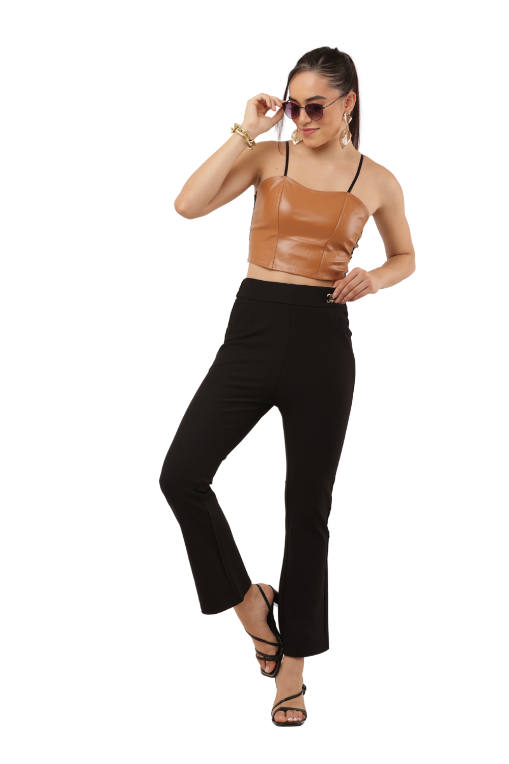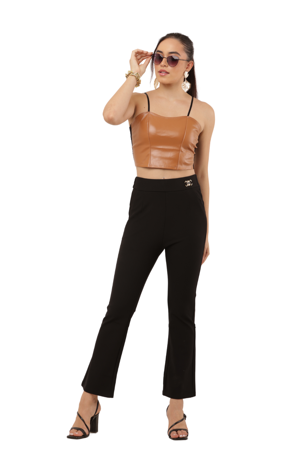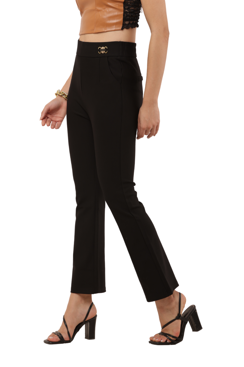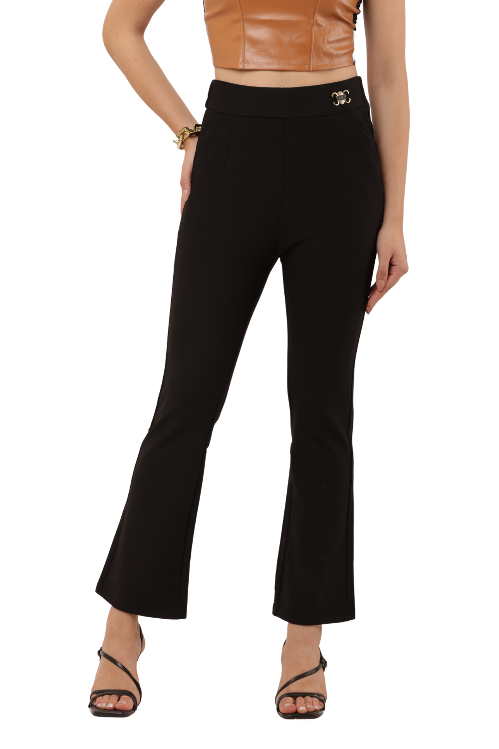 High-Waist Black Flared Pants with Gold Buckle – Korean Fashion Style