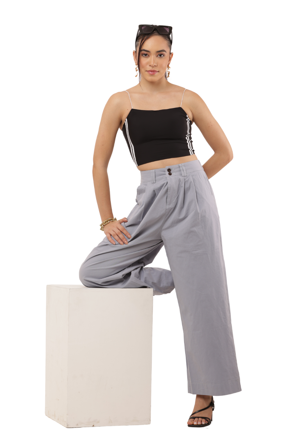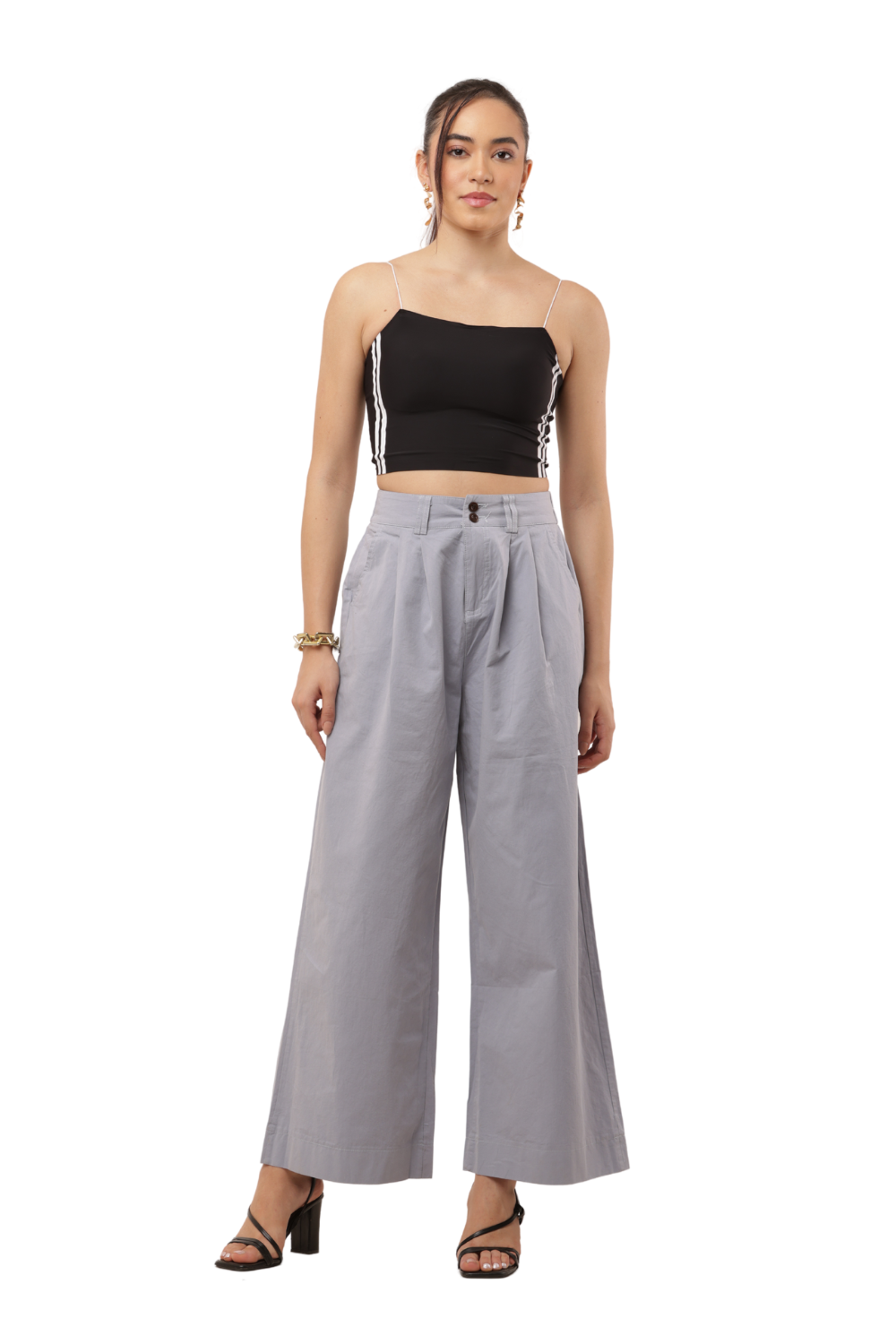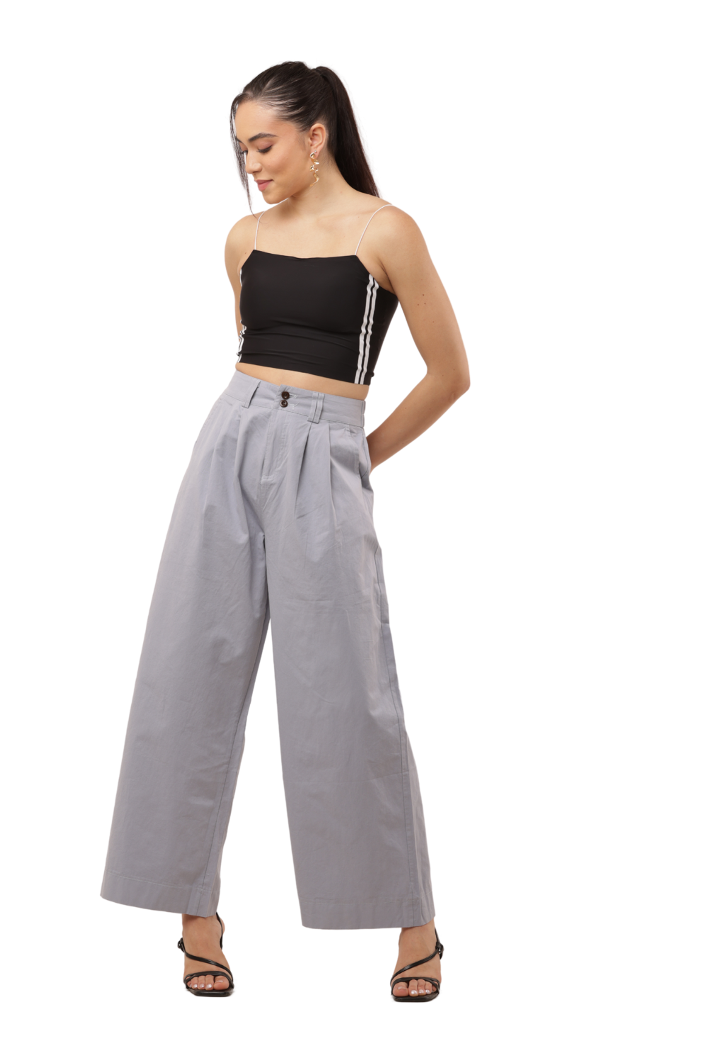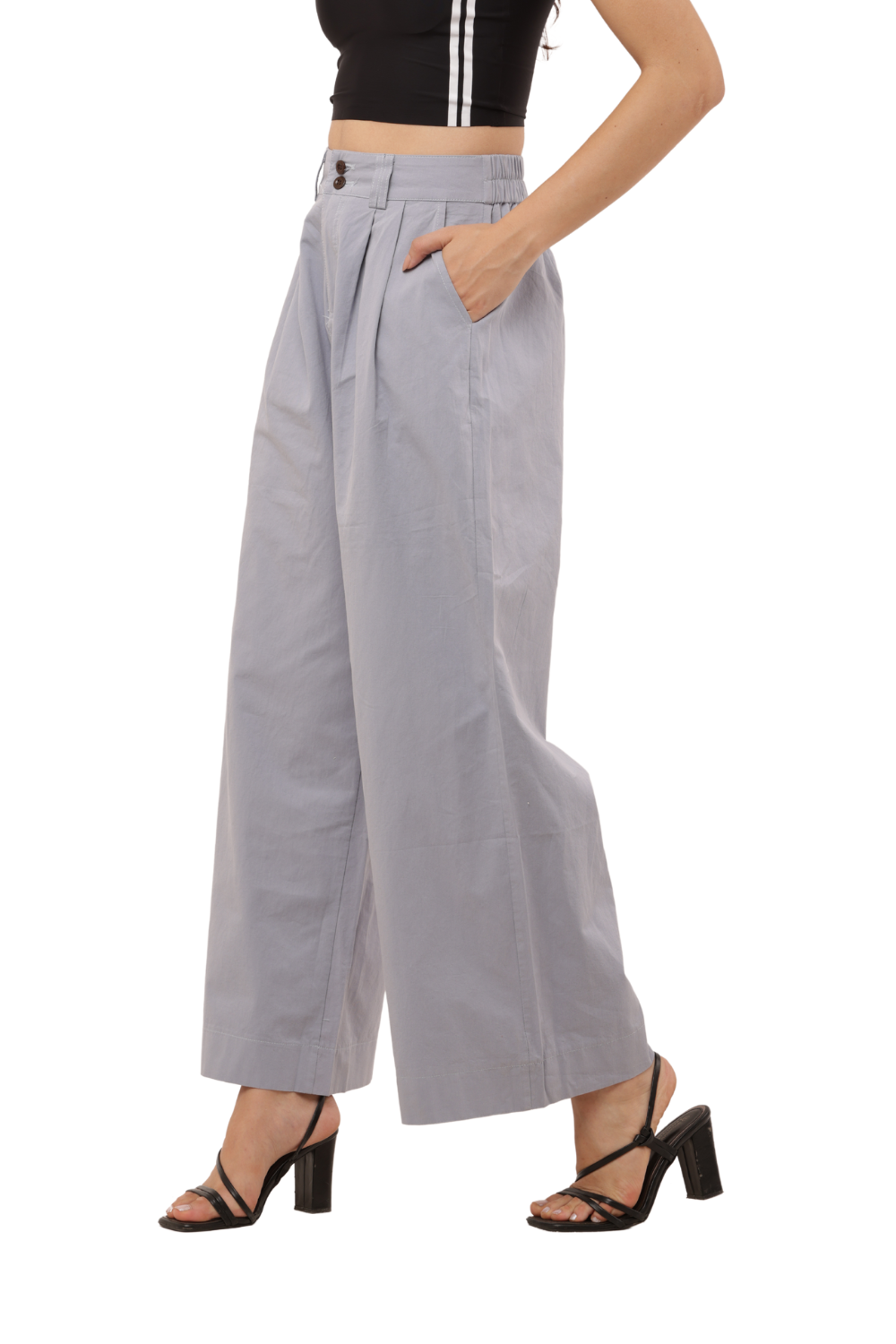 Elevate your everyday look with these High-Waist Wide-Leg Korean Cotton Pants in a stylish light grey shade. Inspired by minimalist Korean fashion, these pants feature a flattering high-rise waist with pleated detailing and a wide-leg silhouette that offers both elegance and comfort. The front button closure and back elastic waistband provide a perfect balance of structure and ease, making them ideal for both casual and semi-formal occasions. Pair them with a cropped top or a tucked-in blouse for a refined Korean clothes aesthetic.