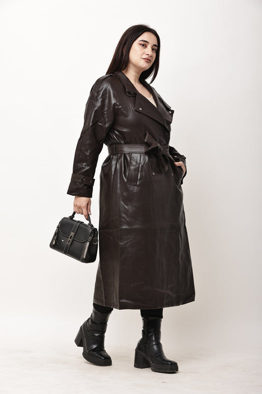 Korean Faux Leather Long Trench Coat for Women | Belted Winter Overcoat